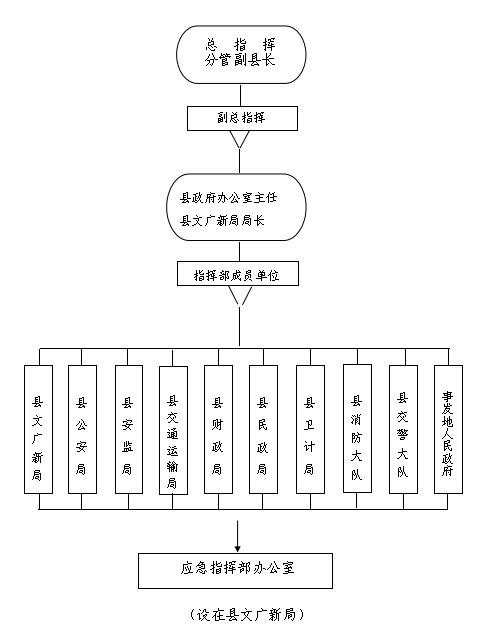 (3)属地负责:按照分级负责的行政管理体制和条块结合的文化管理体制,处置全县区域内公共文化场所和文化活动突发事件,实行条块结合、以块为主、属地管理。经济开发区管委会、各乡镇人民政府(街道办事处)对本行政区域内发生的公共文化场所和文化活动突发事件的处置工作负总责;县文广新局指导协调文化场所和文化活动突发事件应急处置工作。
