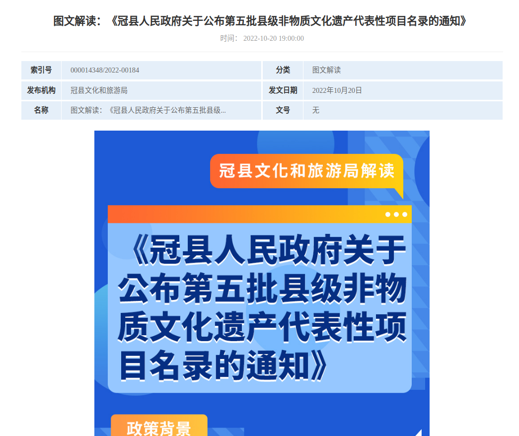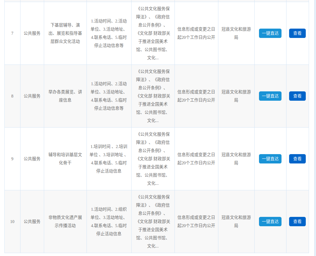 根据《冠县人民政府办公室关于印发2022年冠县政务公开工作要点的通知》(冠政办发〔2022〕7号)要求,不断推进公共文化服务、旅游领域政府信息公开,及时更新发布行政执法、公共服务事项、相关政策、活动开展等信息。