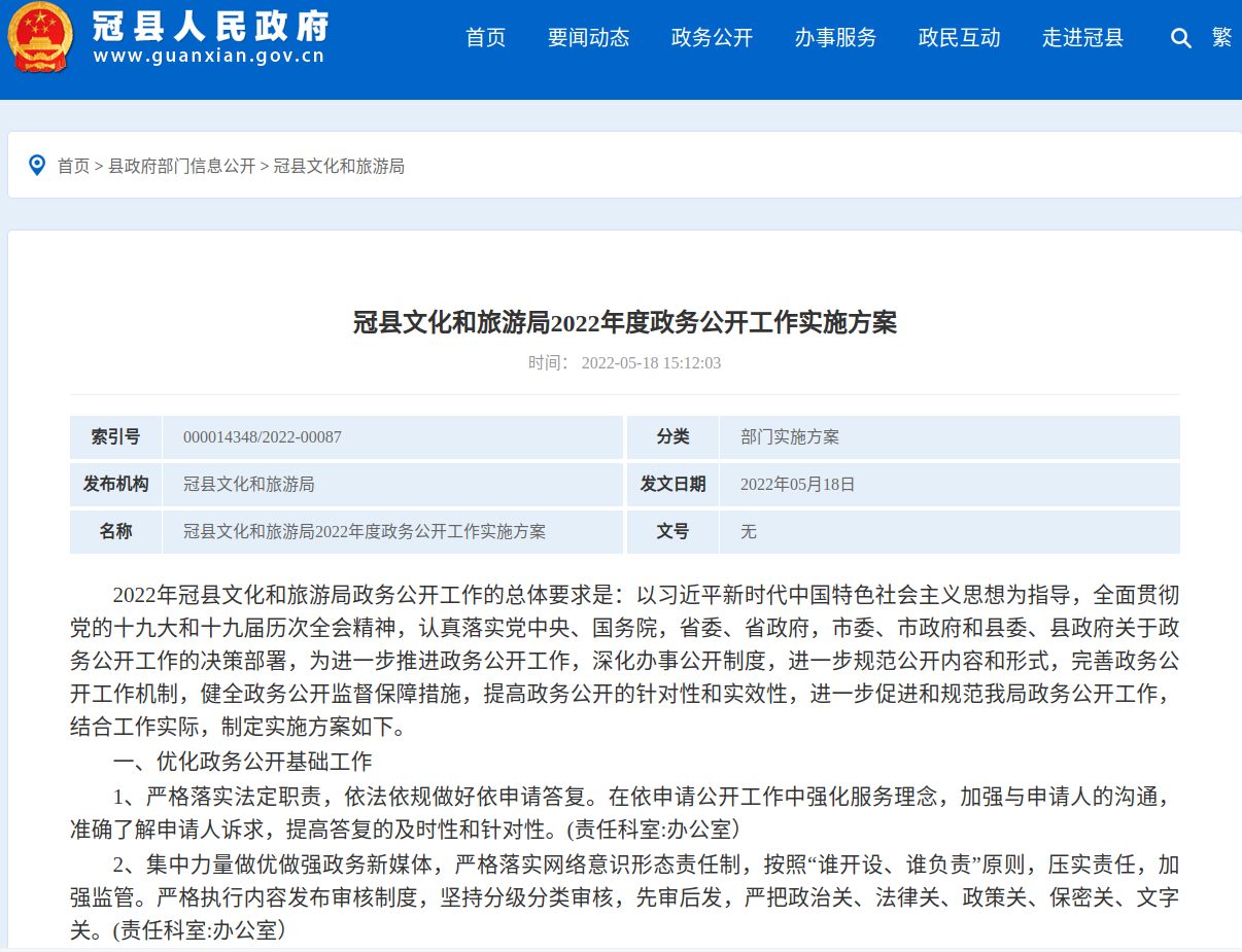 1.政府信息公开制度建设情况。出台了《冠县文化和旅游局2022年度政务公开工作实施方案》,明确要求做好优化政务公开基础工作,严格落实法定职责,依法依规做好依申请答复,集中力量做优做强政务新媒体,优化政策解读、回应关切和公众参与,深化重点领域信息公开。